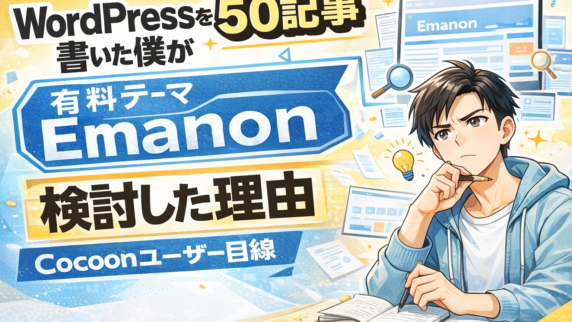 ブログ運営 WordPressブログ50記事書いた僕が、有料テーマEmanonを検討した理由【Cocoonユーザー目線】 WordPressで50記事以上書いた経験から、有料テーマEmanonを調べて分かったメリット・注意点をまとめました。Cocoonユーザー目線で、有料テーマを検討するタイミングも正直に解説します。 ブログ運営